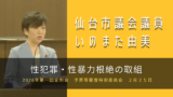 この連続イベントでは、第一部「女性相談から見えてきた課題」と第二部「高齢女性が抱える課題」に焦点を当てて、現場からの報告と女性議員とのクロストークを行いました。私は第一部で、女性であることによる困難な問題の、家父長制や性別役割分業や自己責任論が内面化されている中での家庭内の問題や性搾取に関することなどは、それが社会的な問題として認識されづらく、当事者が自ら議員を含む相談窓口に繋がって解決しようと行動することがまれであるため、さまざまな支援団体や支援者と現場で共に活動することを通じて、行政課題をあぶりだし、改善に向けて動いていることを報告しました。